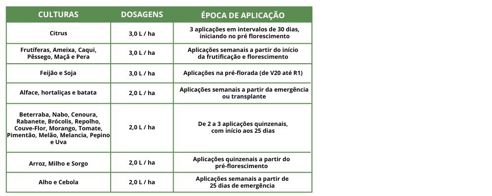 Obs: Doses sugeridas, consulte seu engenheiro agrônomo para melhor adequação conforme suas necessidades específicas.
